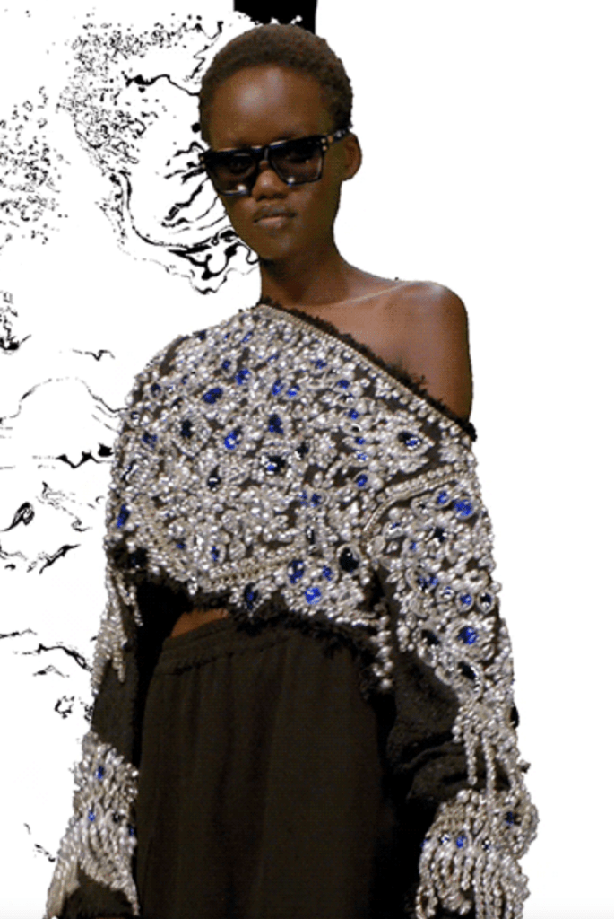 This exuberant resort collection was For Olivier Rouseing a way to pay tribute to his Origins “the horn of Africa” and was also inspired by the exhibition he visited lately “Divas from Oum Keltoum to Dalida”. Bright colors, beautiful motifs, MAXI bags and bejwelled shoes were the key elements to it.
